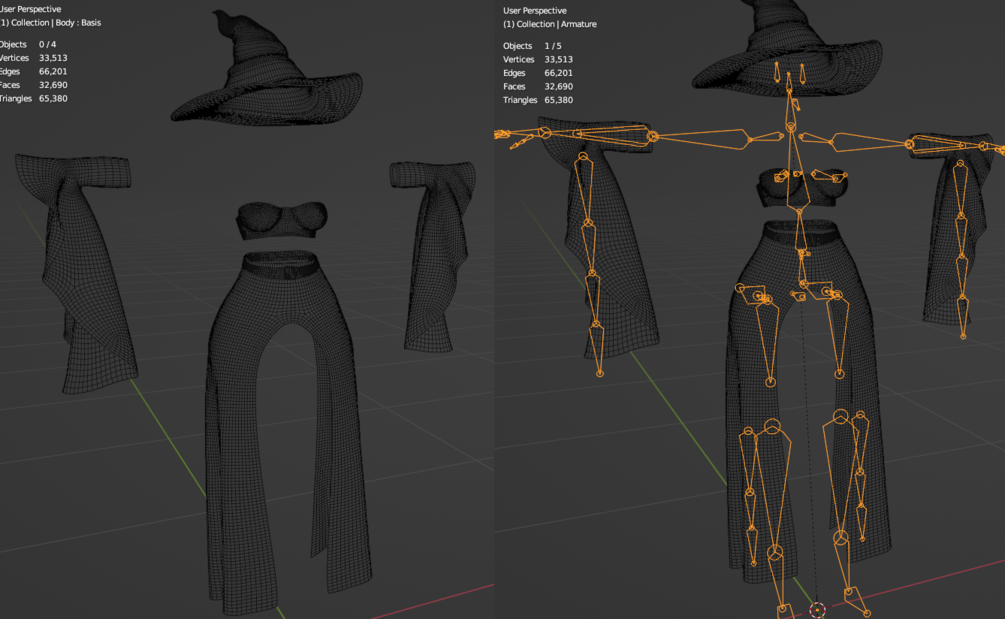 6 Material - Multiple texture files, not atlased, each garment comes with it's own texture and material.